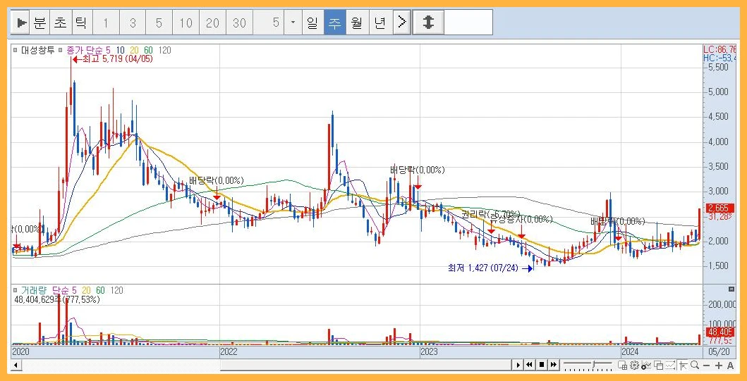 대성창투는 2020년 4월 9일에 최고가 5,719원을 기록한 이후 계속적인 우하향으로 내려오면서 2023년 7월 최저가를 형성한 이후 조금씩 우상향으로 주가가 상승 중입니다.