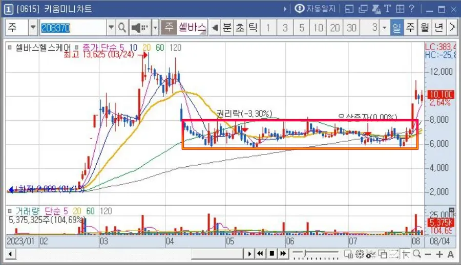 이후 3개월 동안 5,730과 8,200원의 박스권을 유지하면서 조정기를 갖고 이번주에 드디어 그 박스권을 8월 1일 상한가를 기록하면 돌파하였습니다.
