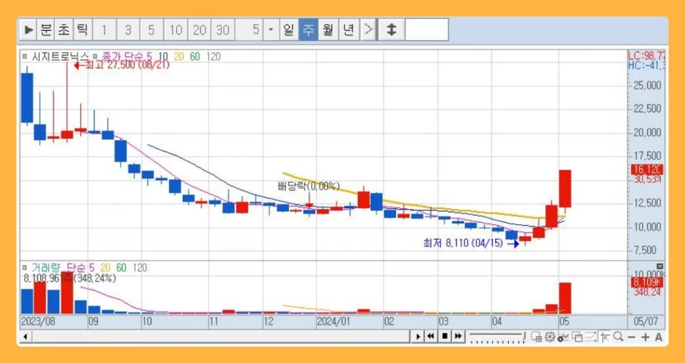 시지트로닉스는 2023년 8월 3일에 코스닥에 상장 이후 계속적인 하락세를 보이다가 4월 16일 최저가를 형성한 후, 4월 한 달간은 완만하게 우상향 하다가 5월 들어 급등형태를 보이고 있습니다.