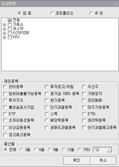 보통 범위지정은 주가범위를 많이 포함시키고 있으며,대상변경에서는 제외종목 항목에 내 스타일에 맞지 않는것을 제외시키는것이 좋습니다.