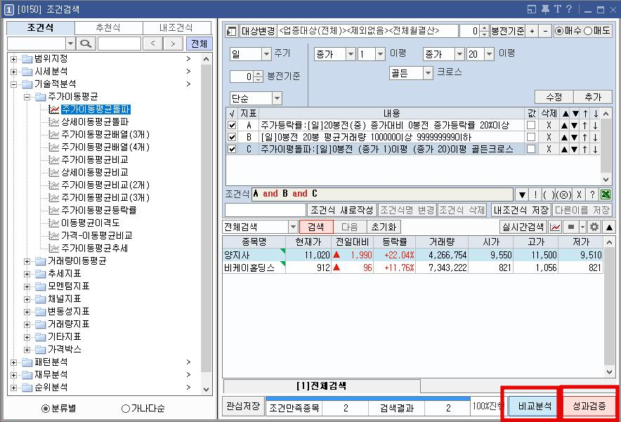 - '단기 이동 평균선이 장기 이동 평균선을 상향 돌파' 조건을 추가합니다. : 종가1이평 종가20이평 골든크로스